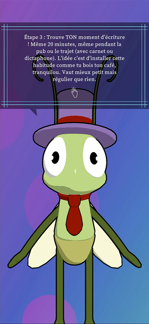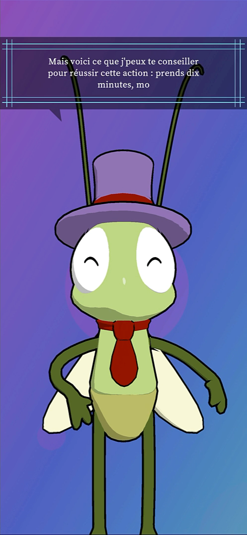- Le compagnon 3D : Jimili, votre ami et mentor 3D dans l’application, vous accompagne à chaque étape. Il célèbre vos efforts, valorise chaque action accomplie et vous relance avec bienveillance quand vous décrochez.
